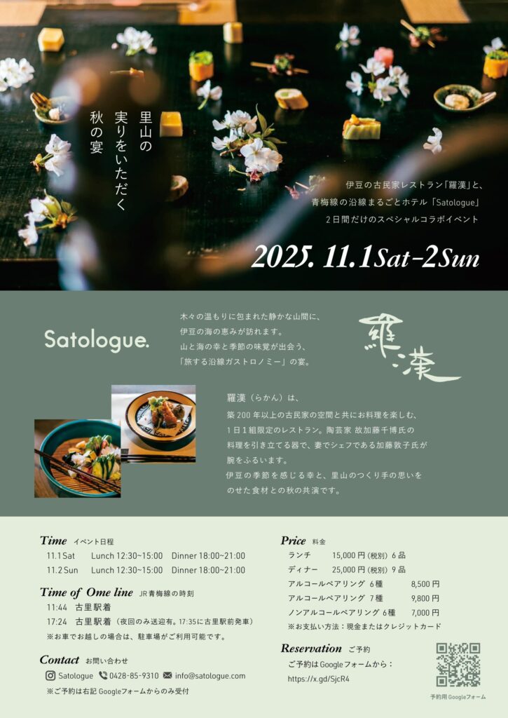 秋のベストシーズンに「里山 秋の宴」と称し、伊豆の有名店「羅漢」とコラボした特別なランチ&ディナーのご提供します。「羅漢」シェフの加藤氏と「Satologue」シェフの駒ヶ嶺・高波が本イベントのために考案し、地域の食材と旬の味覚を盛り込んだ精細なガストロノミーです。