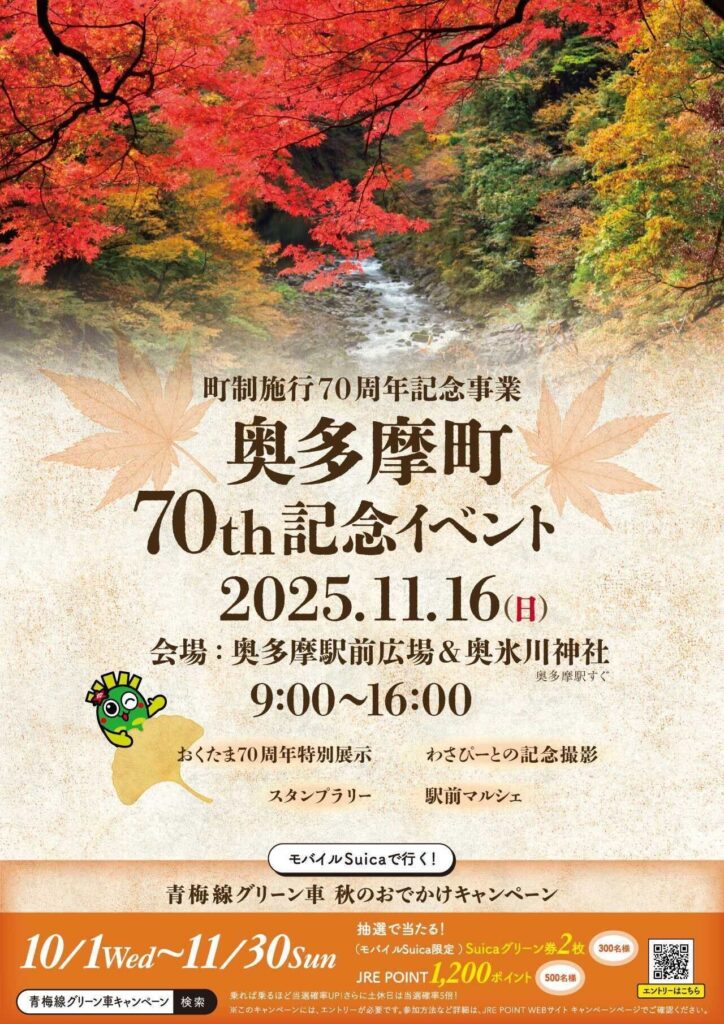 美しい紅葉の季節に、奥多摩町が町制施行70周年を迎えます。