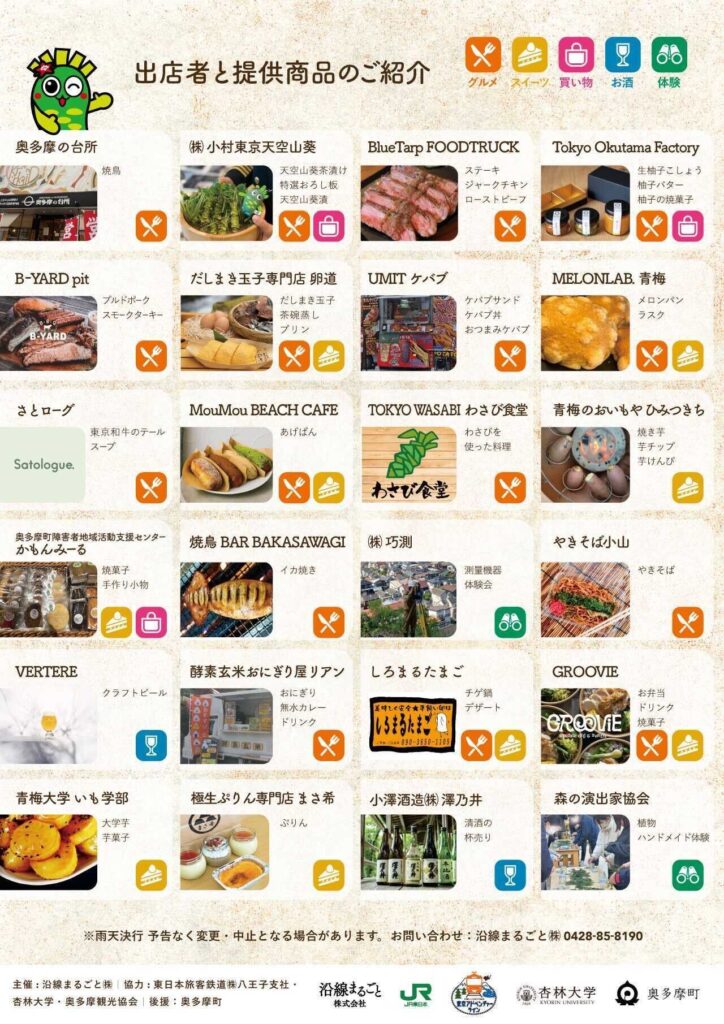 だし巻き玉子・ステーキ・ケバブ・プリンなどのグルメやスイーツ、奥多摩のわさび・ゆずを使った物販、地元のクラフトビールや地酒、測量機器や植物ハンドメイドの体験ブース